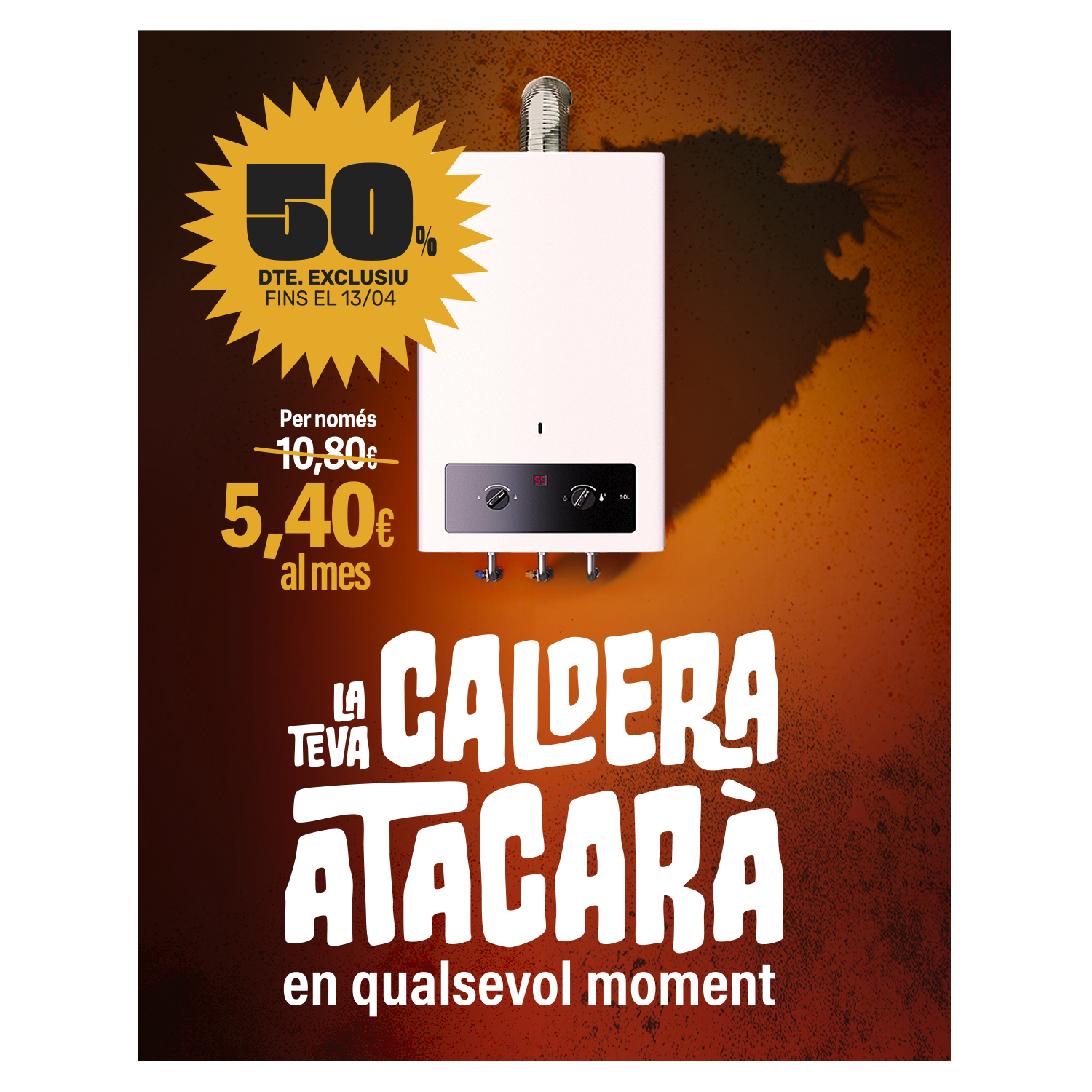 Promoció vàlida fins al 13 d’abril de 2025. *Preu oferta vàlid pel primer any, segon any preu habitual (130€ manteniment caldera). Promoció no acumulable a altres ofertes, promocions o descomptes ni vàlida per a aquells usuaris que durant els últims dos anys s’hagin beneficiat d’alguna oferta, promoció o descompte.