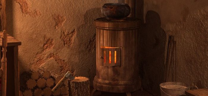 El fuego se halla en el interior de la estufa y la combustión depende del sistema de regulación de la entrada del aire. El diseño permite que el humo proveniente del fuego sea capaz de calentar la habitación mediante el tubo extractor.